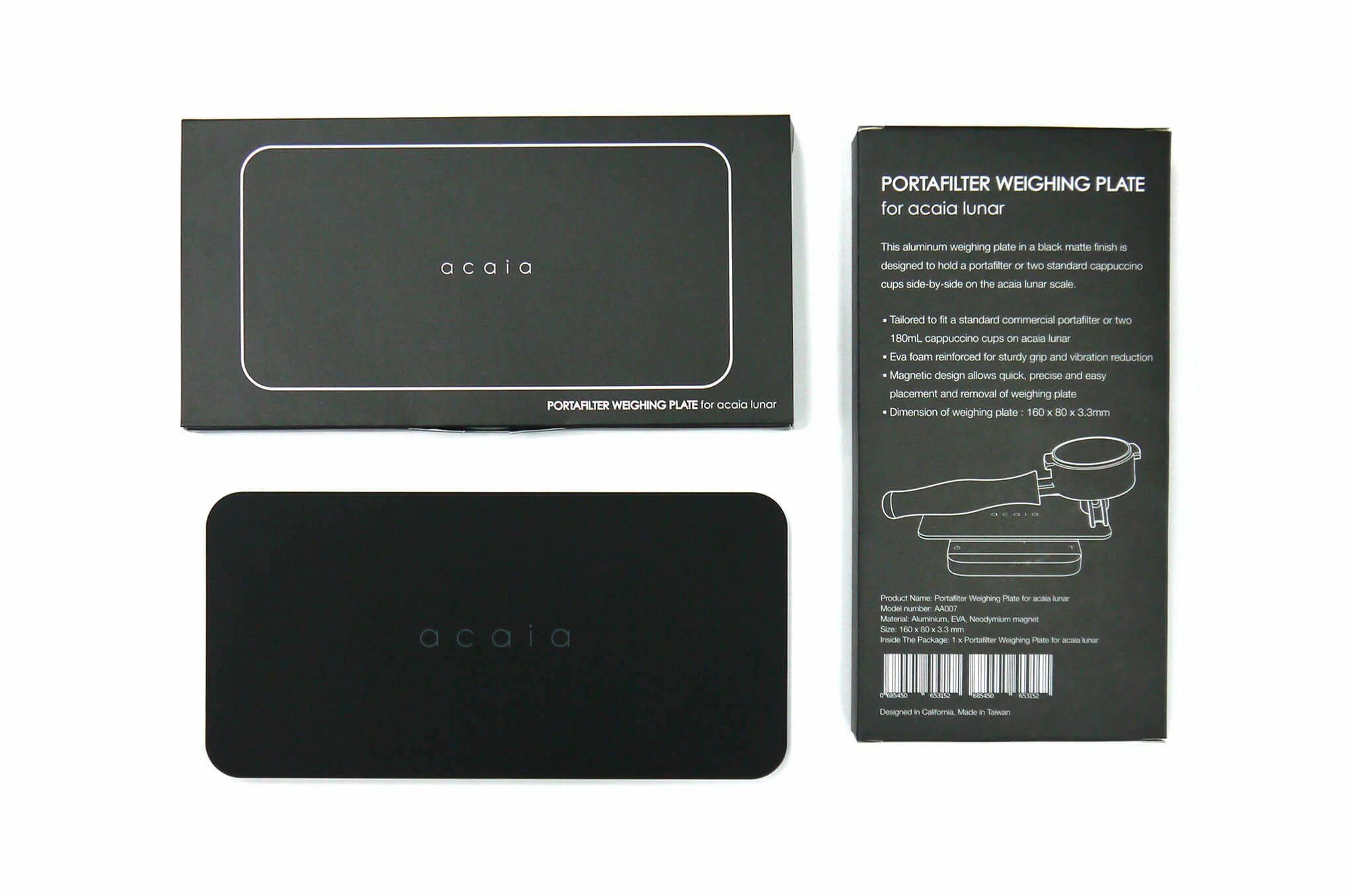 This aluminium magnetised weighing plate in a black matte finish is designed to hold a single portafilter, or two standard cappuccino cups side-by-side on the acaia lunar scale.