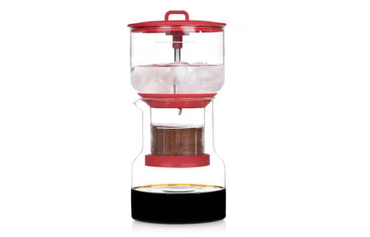 The Cold Bruer’s upper chamber holds ice and water and features a flow regulation rod that can be adjusted to change the water’s dripping rate. The center chamber holds a filter and the ground coffee, which is slowly pelted by water drops. The bottom chamber collects the cold brew concentrate as it slowly drains from the coffee bed and through the filter.