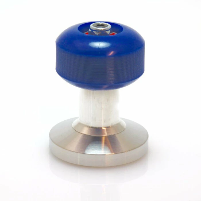 The skateboard wheel can spin slightly if desired, but can also be locked down by tightening the nut on top of the tamper handle. To loosen, simply turn the nut counterclockwise. The tamper is also able to be customized by swapping out the stock wheels and replacing it with any skateboard wheel of choice. All skateboard wheels fit!