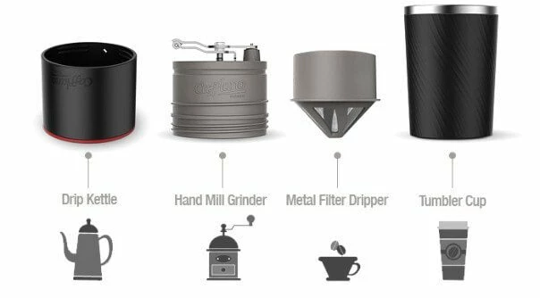 All-In-One Coffee Brewer – Includes all the gear you need to brew coffee manually: a drip kettle, a pour over cone and stainless steel filter, a burr coffee grinder, and a tumbler with a lid.