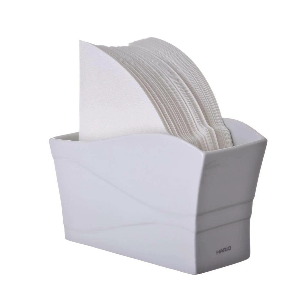 This is dishwasher-safe ceramic Hario V60 filter paper stand. Displays V60 paper filters in your cafe for easy and quick access.